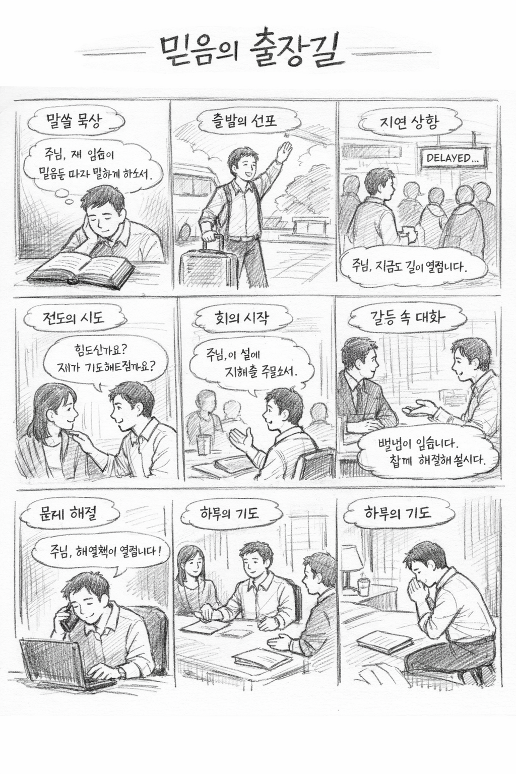 막 10:52 말씀에서 예수님께서는 믿음이 있을 때 역사하시며 우리는 믿음을 갖는 것이 중요하다는 것을 다시 생각하게 되었고, 믿음을 가진 삶을 살아가기 위해, 오늘도 예상하기 어려운 일정들 속에서 하나님의 세계를 바라보며 믿음으로 전망하는 시도를 하는 모습입니다. ///////////////////////////// ///////////////////////// 시130:8 말씀을 보며, 저의 죄를 돌아보되 너무도 심각하여 옷에 먼지가 묻듯이 너무도 많은 죄가 제 곁에 있음을 생각하게 되었으며, 그러한 죄를 해결할 수 있으신 분은 오직 예수님 한 분이심을 기억하며, 제가 죄를 돌이키며 자백하고 회개하는 시간을 지속적으로 가지기 위해 다양한 시도와 시간을 갖는 모습을 그려주세요. 특별히 독일 프랑크푸르트에서 영국 버밍햄으로 비행기로 이동하는 과정과 미팅하는 과정에서도 틈틈히 죄를 생각하며 회개하는 시간을 갖는 모습입니다. ///////////////////////// ////////////////////////////// 신 1:34-36 말씀을 보며, 주님을 온전히 따르는 자가 되도록 마음을 함께하여 전심으로 기도하는 시간을 가지는 모습입니다.