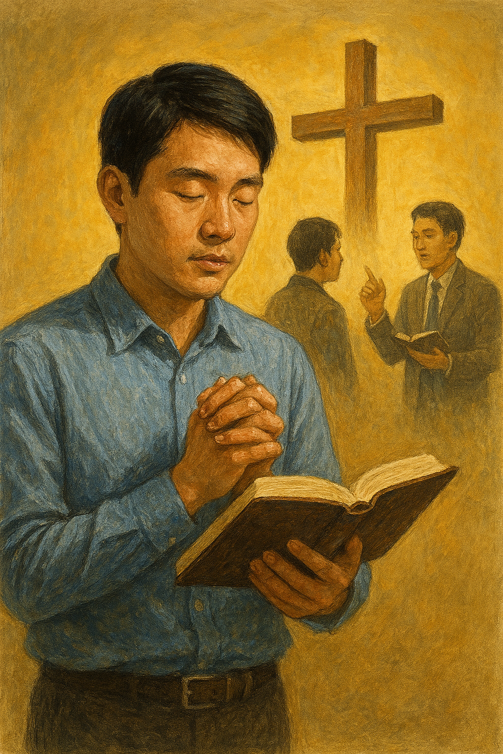 신 32:39 - 하나님은? - 생명과 죽음 주실 수 있는 분 /////////////////////// /////////////////////////////// 시 125:2 말씀과 같이 저를 돌보시고 제 주변에서 저를 보호하시고 인도하시는 주님을 찬양하며 그 분과의 교제에 힘쓸 것을 적용하겠습니다. 주여, 제 주변을 감싸시고 인도하시는 주님을 찬양하는 모습입니다. /////////////////// //////////////////////////// 창 32:36 말씀을 보며, 야곱이 하나님과 깊이있는 씨름으로 지칠대로 지쳤고, 자신이 어려움에 처한 상황 속에서도 야곱을 영적인 축복을 받기 위해 그 자리에 머물렀을 뿐 아니라 나아가 하나님께로부터 축복을 받으려 시도했습니다. 저도 하나님께 축복을 받기까지 간절히 기도하는 삶을 사는 모습을 그려주세요. 50세 남성이 한국에서 학술대회 참여하면서도 하나님께 간절히 기도하고 씨름하는 모습입니다.