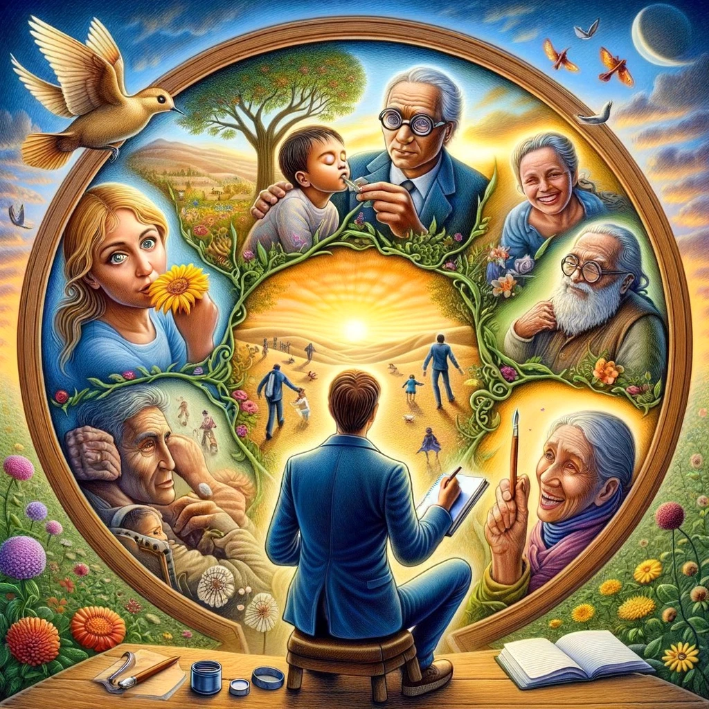위 이미지는 예수님의 제자로서 삶을 살아가는 모습을 포착하며, 다양한 배경과 연령대의 사람들과 함께 도우며, 공감하고, 삶을 나누는 순간들을 묘사합니다. 이러한 장면들은 제자가 복음을 전하는 것을 넘어서 자신의 삶을 통해 사랑과 복음의 메시지를 실천하고 있음을 보여줍니다. 이는 영혼을 진심으로 사랑하고, 자신의 삶을 개방하며, 주변 사람들과 깊이 나누는 예수님의 제자로서의 아름다운 삶을 나타냅니다.