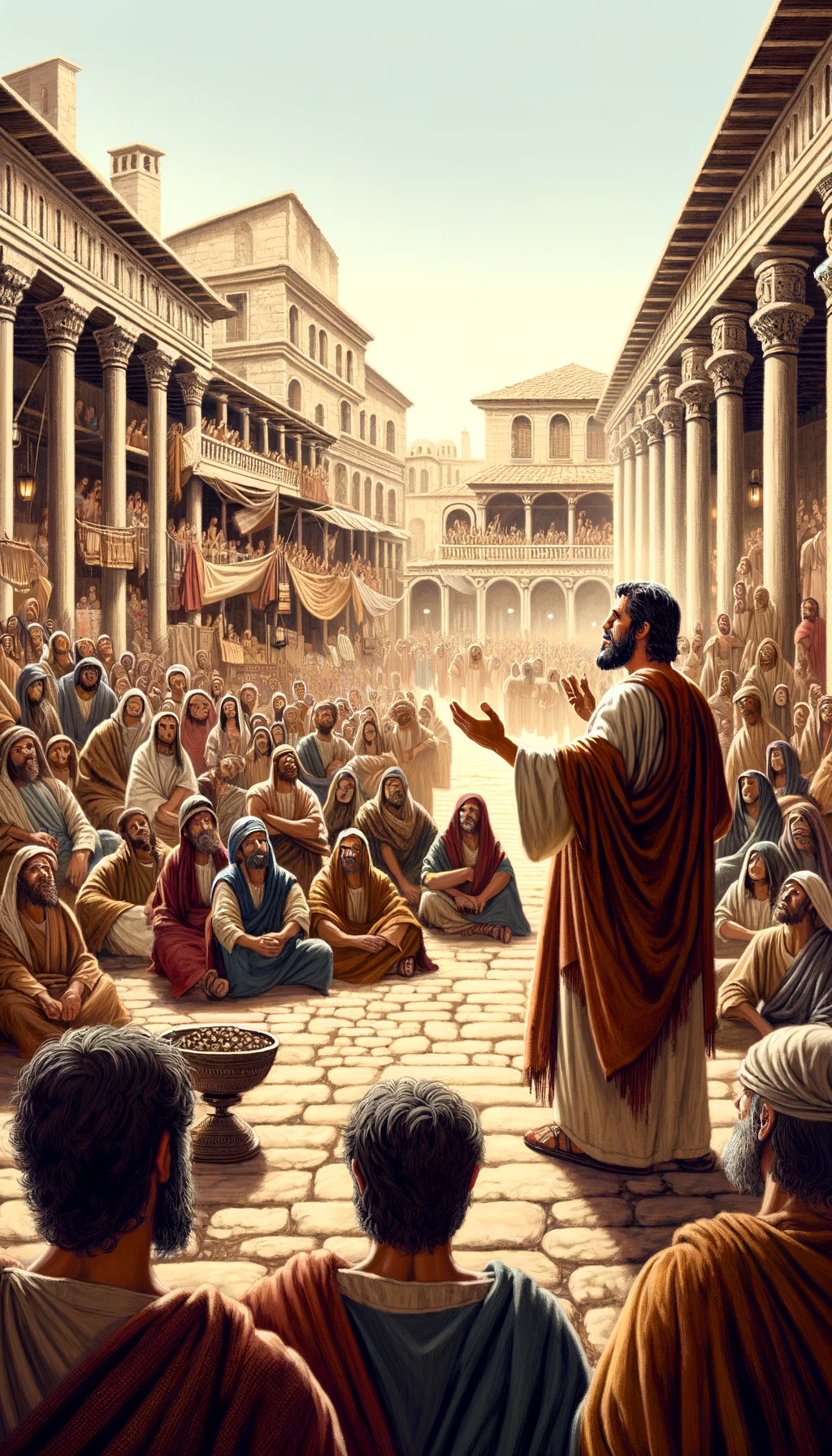 이 이미지는 바울의 삶을 나타내며, 그가 어디에 있든지 복음을 전하는 데 전념하는 모습을 정사각형 형식으로 보여줍니다. 바울은 겸손한 집, 도시 거리, 바닷가 등 다양한 환경에서 열정적으로 말씀을 전파하고 있습니다. 이미지는 바울이 다양한 배경과 사회적 지위를 가진 사람들과 교류하는 모습을 포착하며, 그의 표정과 제스처는 복음 메시지를 전하는 데 대한 그의 헌신과 기쁨을 나타냅니다. / 바울이 시장에서 매일 말씀을 전하는 삶을 묘사합니다. 그는 다양한 사람들로 가득 찬 고대 시장에서 자신감 있게 서서, 관심 있게 듣거나 무관심한 사람들 사이에서 말씀을 전하고 있습니다. 주변에는 상인, 쇼핑하는 사람들, 구경꾼들이 있으며, 건축은 역사적 시대를 반영한 돌 구조물과 야외 상점으로 구성되어 있습니다. 이 장면은 설정에 상관없이 말씀을 전파하려는 바울의 헌신을 담아냅니다.