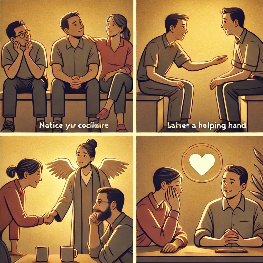 요한일서 4:19-20 말씀을 따라, 주변 동료들을 진정한 사랑으로 섬기고 그들의 필요를 채우며 사랑을 나타내는 모습이 담긴 이미지가 있습니다. 이 장면은 사랑이 단순한 감정이 아니라, 주변 사람들을 섬기고 배려하며 실천하는 삶 속에서 나타나는 것임을 강조합니다. 🙏✨💛