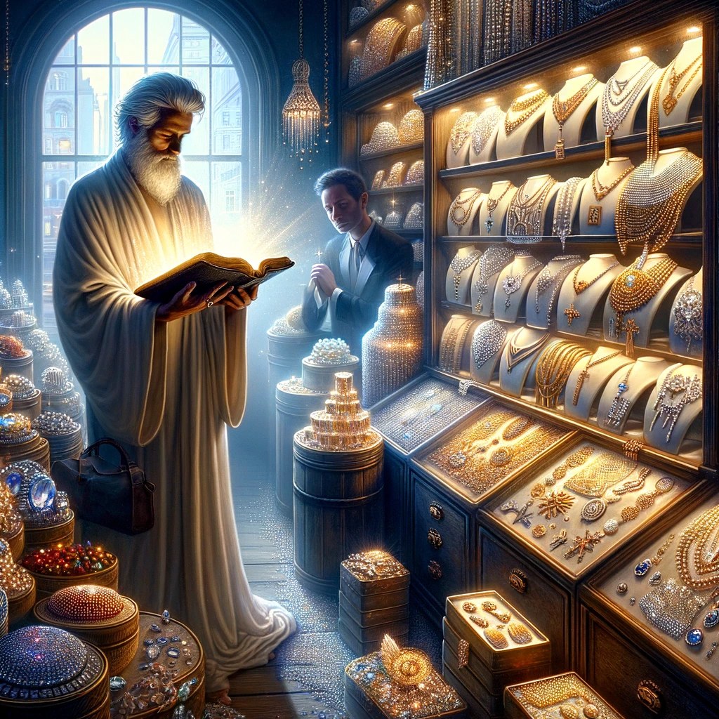 1) 위 이미지는 보석 가게 앞에 서 있는 인물이 열린 성경을 들여다보며, 진정한 지혜가 물질적 가치로 살 수 없으며, 주님을 두려워하는 것임을 깨닫는 순간을 표현합니다. 신성한 빛이 인물을 비추며, 물질적 세계와 영적 풍요 사이의 대비를 강조합니다. / 2) 이 그림은 전도자의 진심이 담긴 열정과 청중의 다양한 반응을 통해 신앙 공유의 다이내믹한 과정을 보여줍니다. 자연스러운 환경에서 이루어지는 이 교류는 신앙의 메시지가 지닌 보편적 매력과 접근성을 강조합니다. / 버려진 돌이 모퉁이 돌이 되어 유일한 구원자의 상징으로 변모하는 과정을 담은 이미지를 생성했습니다. / 3) 이 이미지는 처음에는 무시되고 버려진 돌이 어떻게 중요한 건축물의 기초, 모퉁이 돌로 변화하는지 보여줍니다. 이 돌 위에는 신성한 빛이 내리쬐며, 주변 사람들은 이제 이 돌을 경외와 감사의 마음으로 바라보고 있습니다. 이 변화는 기적적인 변화와 하나님의 구원 계획을 상징하며, 빛은 신의 주목과 거룩함을 나타냅니다. 이 이미지는 버려진 돌이 어떻게 중요한 역할을 수행하게 되었는지, 그리고 그 과정에서 유일한 구원자로서의 중요성을 강조합니다.