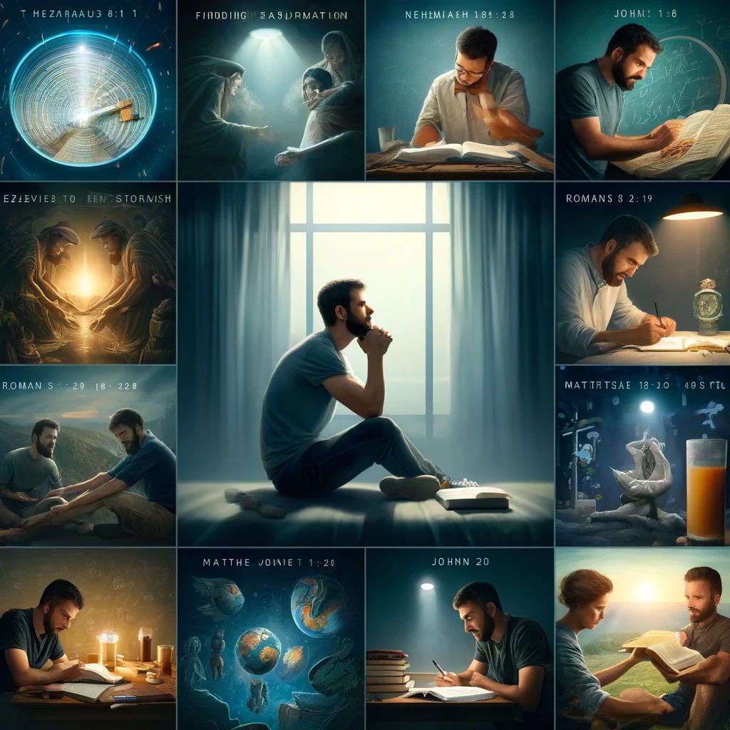 현대인이 바쁜 삶 속에서도 주님을 찬양하며 깊은 평안함을 누리는 모습을 담은 이미지가 있습니다. 다양한 일상 속에서 기도하고 예배하며, 산 꼭대기에서 주님을 찬양하는 장면도 포함되어 있습니다. ///// 현대인이 다양한 성경 구절을 깊이 묵상하고 이를 일상생활에 적용하는 모습을 담은 이미지가 있습니다. 각각의 장면은 에스겔 37:1,10, 느헤미야 8:10, 로마서 2:16 및 16:25, 요한복음 19장, 마태복음 20장, 로마서 15:22-33을 묵상하며, 기도하고 성경을 공부하며 복음을 나누고, 하나님의 임재를 느끼며 기쁨과 헌신으로 살아가는 모습을 보여줍니다.